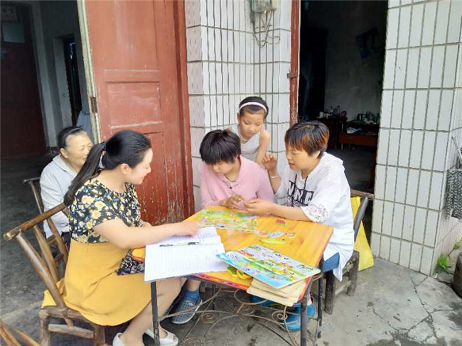 5月26日,学校送教老师陈永红与师张艳到车湖垸刘静家送教。从桃源乘车到车湖垸,下车后,十八弯的羊肠小道还要走2个多小时才能到学生刘静家里。陈永红老师敏感的皮肤在火辣辣的太阳光照耀下像剥了皮似的红肿,但仍坚持完成送教。与我门一同前往的还有该村的妇女主任。在围墙外见到了刘静,立即向她打招呼,此刻的刘静望了望我们说:老师!我很高兴。与奶奶寒喧之后,检查上一次布置的作业:每天捡黄豆一百粒。看到她将黄豆一粒粒拾起放在碗里面,以前僵硬的手指现在动弹自如许多。她爷爷在一旁张大着嘴乐呵呵地笑着说:有进步了、有进步了!最后张艳老师反复强调:孩子的训练就从生活的点滴开始,要她做一些力所能及事情。