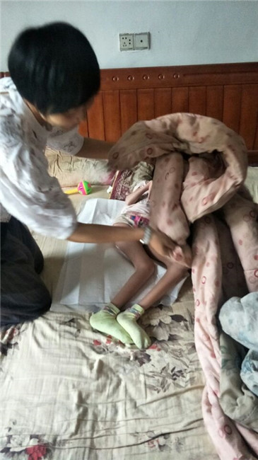 她还是一如既往的躺在那脏乱的房间里,叫她的名字,她给我们唯一的反应是高兴的躺在床上大叫,她在欢迎我们,可她全身能动的就只有眼睛和嘴了。刚进门,张超就拿出自费买的纸尿片,为她换上,还给她带了红枣、燕麦、牛奶、自家的腊肠、以及凉席,并嘱咐爸爸一定要给她吃。我们还为她做了康复训练,主要是活动肌肉以及眼睛追视物品,刘思吕可高兴了,一个劲的大叫。面对这样情景,我觉得我们所做一切都是值得的,至少为这个家庭带去了一点点的温暖,刘思吕的爸爸也表示很感激我们为他做的一切,为他们父女带去了慰藉。所以我们在此呼吁,希望有更多的爱心人士多多关心他们。