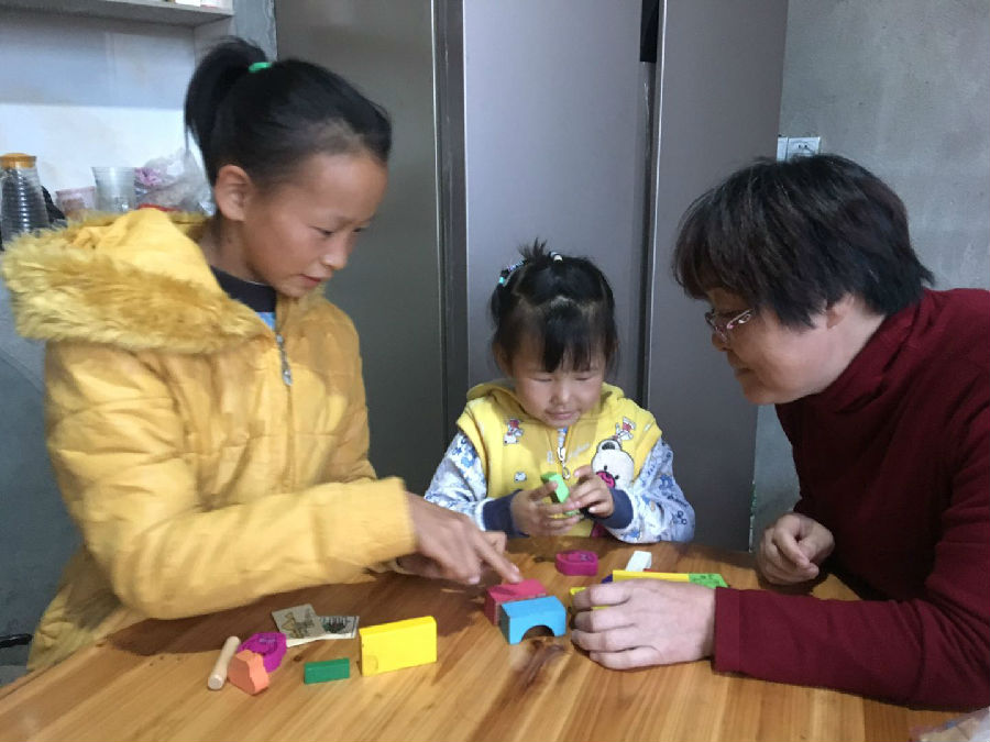 刚到她们家,两小姑娘笑嘻嘻迎接我们。因为姐妹俩,这个家庭没有太多的幸福。笔者的到来好像给他们带来了大大的希望。一坐下来杜老师开始教孩子们涂色,然后耐心的教姐妹俩搭积木,边搭边介绍积木的颜色和形状,和孩子们开心的交流着搭出来的形状,并给它们取名,孩子们玩得很高兴。当杜老师上数学课的时候,发现了孩子们并不配合,根本不理解所讲述的知识点,一个知识点或许要反复训练多次,又或者经过反复的训练,也无法达到目标。但是她不会因此而浮躁,因为她知道,送教工作不是一天两天能做好的,而是一场持久战。离开的时候姐妹俩不舍的抱着两位老师,久久不肯松开,她们太渴望被关注太渴望学习那些新鲜的东西了。我们深知只要每次的出行都让孩子们觉得开心,对我们来说就已足够。