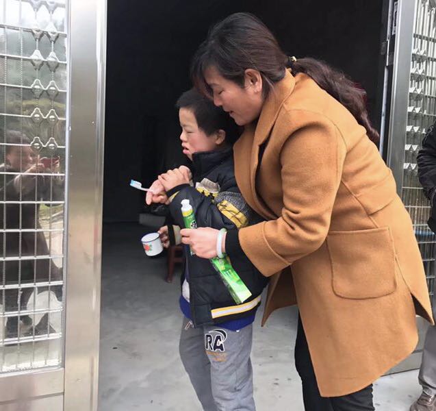 曾嘉宏,14岁,属于智力残疾,由年迈的爷爷奶奶抚养长大,生活自理能力差。余文杰老师对他手把手教最基本的生活自理训练。图中在教他挤牙膏。年迈的爷爷也在一旁观察着,学习着如何训练孩子的方法呢!