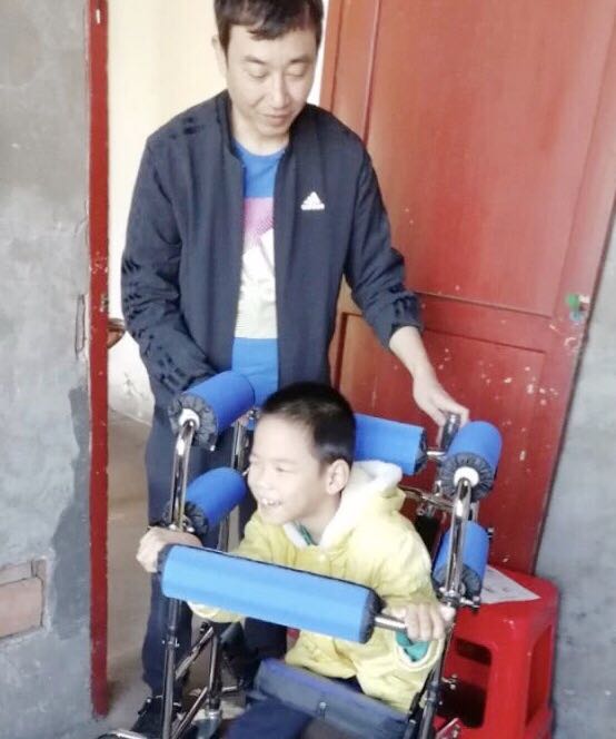 江林和他妈妈一直以来的心愿就是希望能有一辆脑瘫儿童助行器,但是昂贵的费用让这个贫困的家庭负担不起。知情后,袁四方老师和赵磊老师自己筹集资金,买了一辆助行器,作为礼物送给了他,实现了他们家一直以来的心愿。图为坐上助行器后幸福的模样。